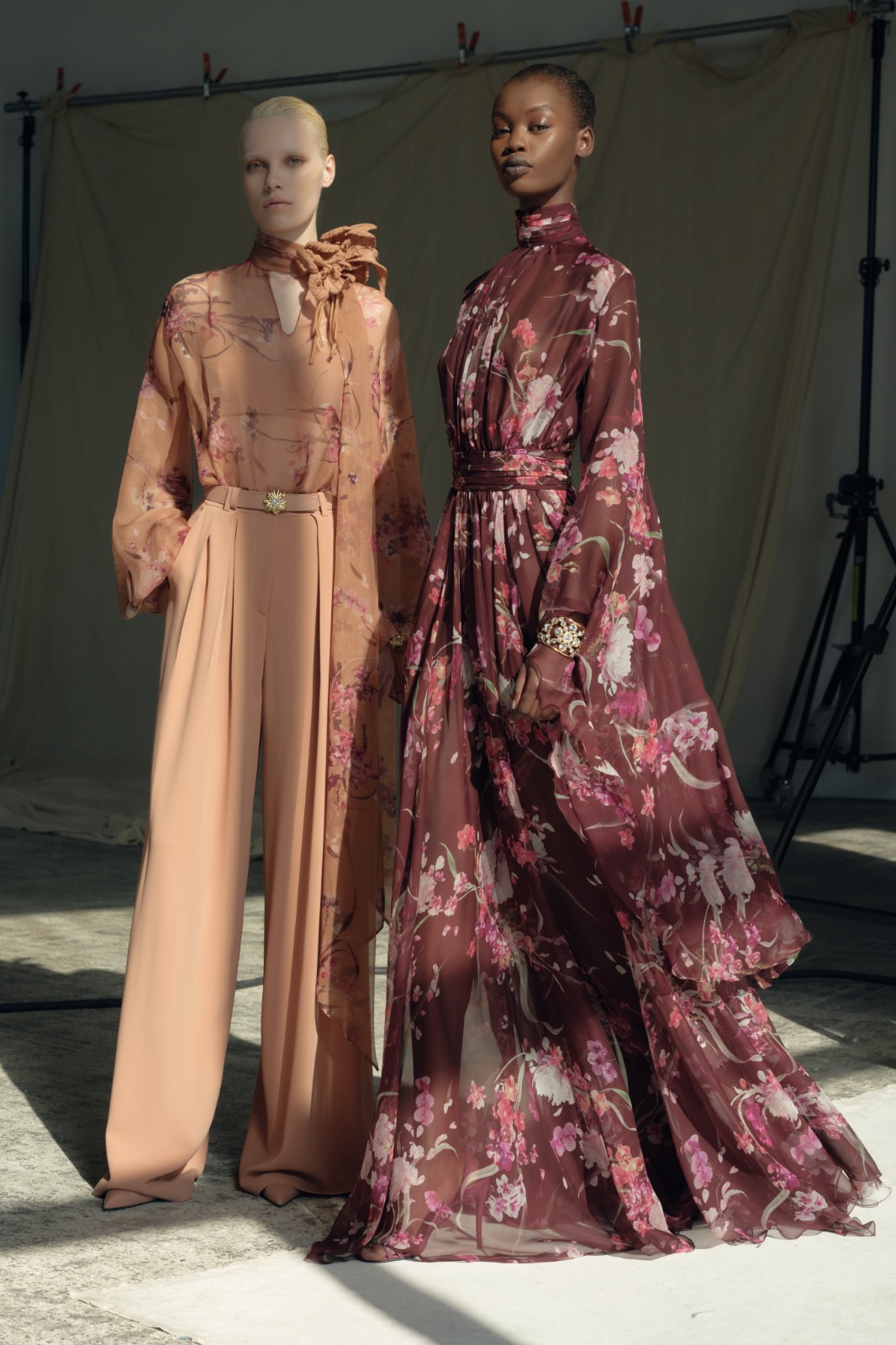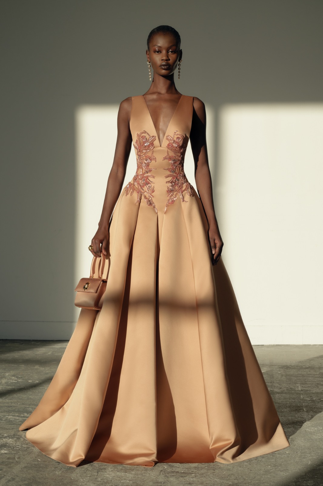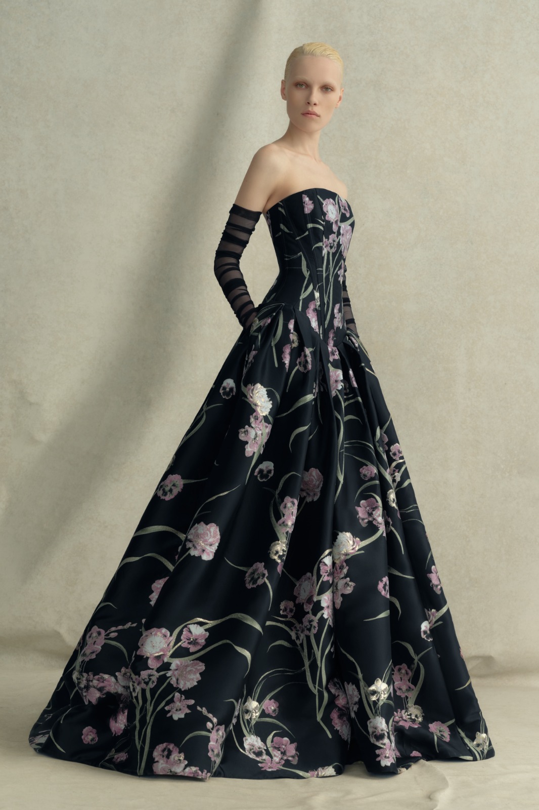 لكن هذا الموسم، خُففت الإسراف الذي يعشقه مراد بضبط النفس. بدت المجموعة وكأنها مبنية على توتر مثمر: شيفون مزهر بقصات هندسية، ومخمل محفور بخطوط بسيطة، وريش مارابو بارز بين الحين والآخر، لكن فقط عند الصدر أو الأكمام. كانت هناك لمسات من الخيال الجامح: تطريزاتٌ تُشبه الثريات على بلوزة قصيرة وتنورة سوداء طويلة، وزخارفٌ نابضةٌ بالحياة من الفاوانيا والأوركيد، وبعض الزخارف المُتقنة من الريش والدانتيل على فستان أسود بياقة هالتر وبلوزة.