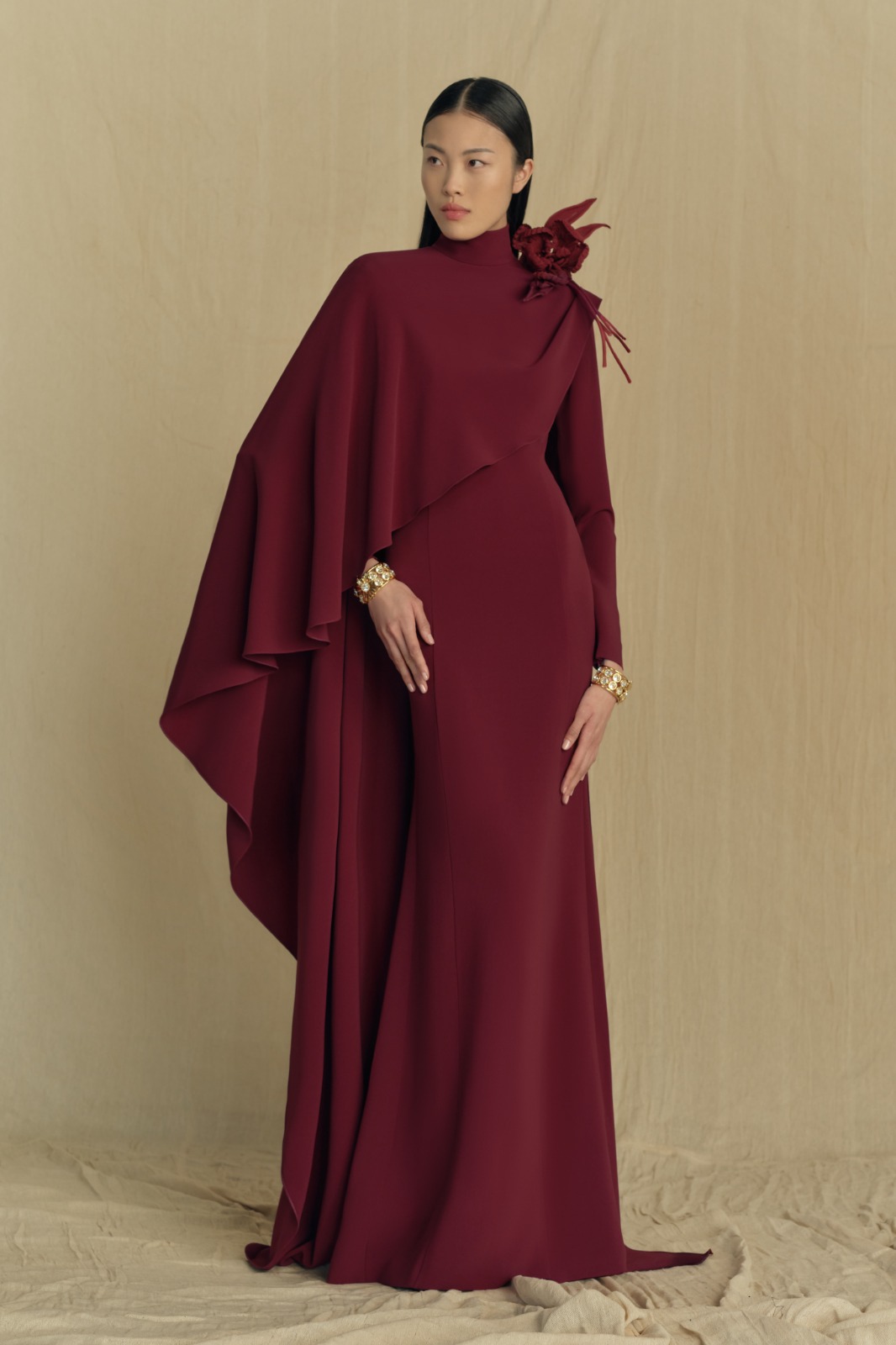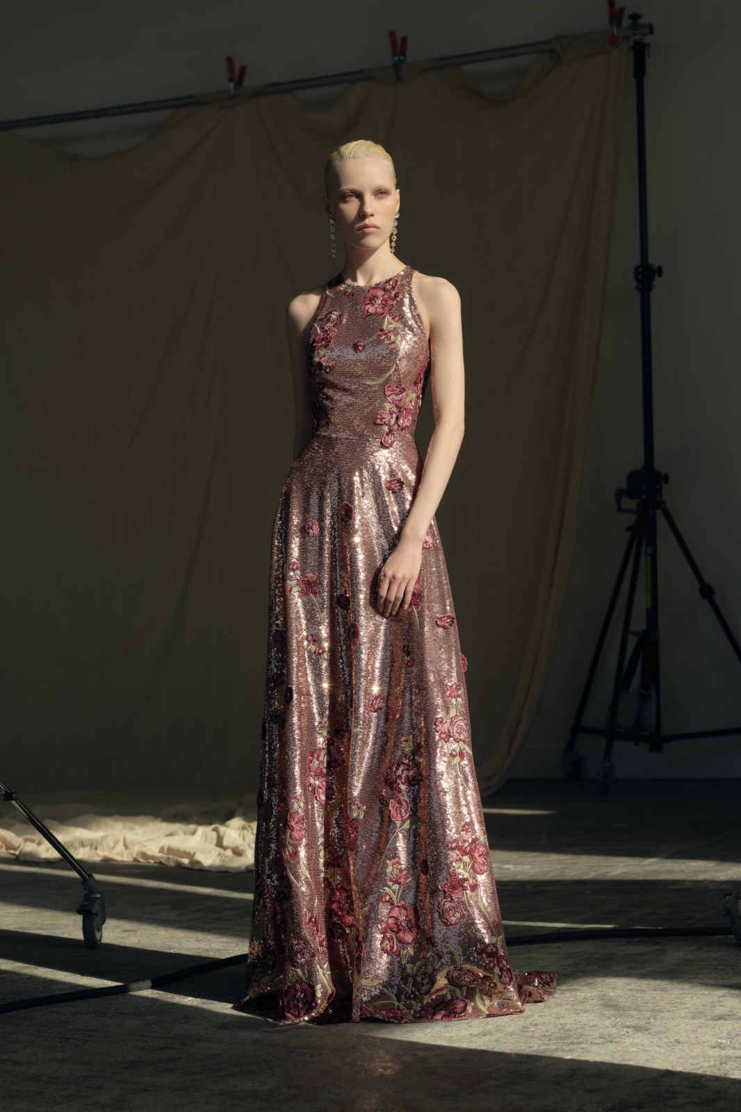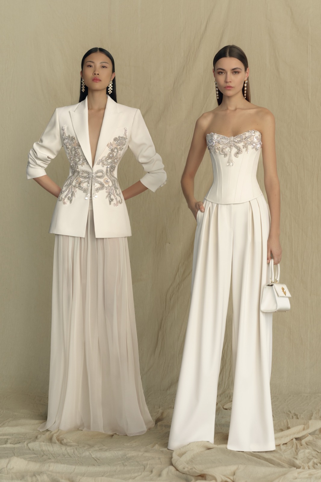 لكن هذا الموسم، خُففت الإسراف الذي يعشقه مراد بضبط النفس. بدت المجموعة وكأنها مبنية على توتر مثمر: شيفون مزهر بقصات هندسية، ومخمل محفور بخطوط بسيطة، وريش مارابو بارز بين الحين والآخر، لكن فقط عند الصدر أو الأكمام. كانت هناك لمسات من الخيال الجامح: تطريزاتٌ تُشبه الثريات على بلوزة قصيرة وتنورة سوداء طويلة، وزخارفٌ نابضةٌ بالحياة من الفاوانيا والأوركيد، وبعض الزخارف المُتقنة من الريش والدانتيل على فستان أسود بياقة هالتر وبلوزة.