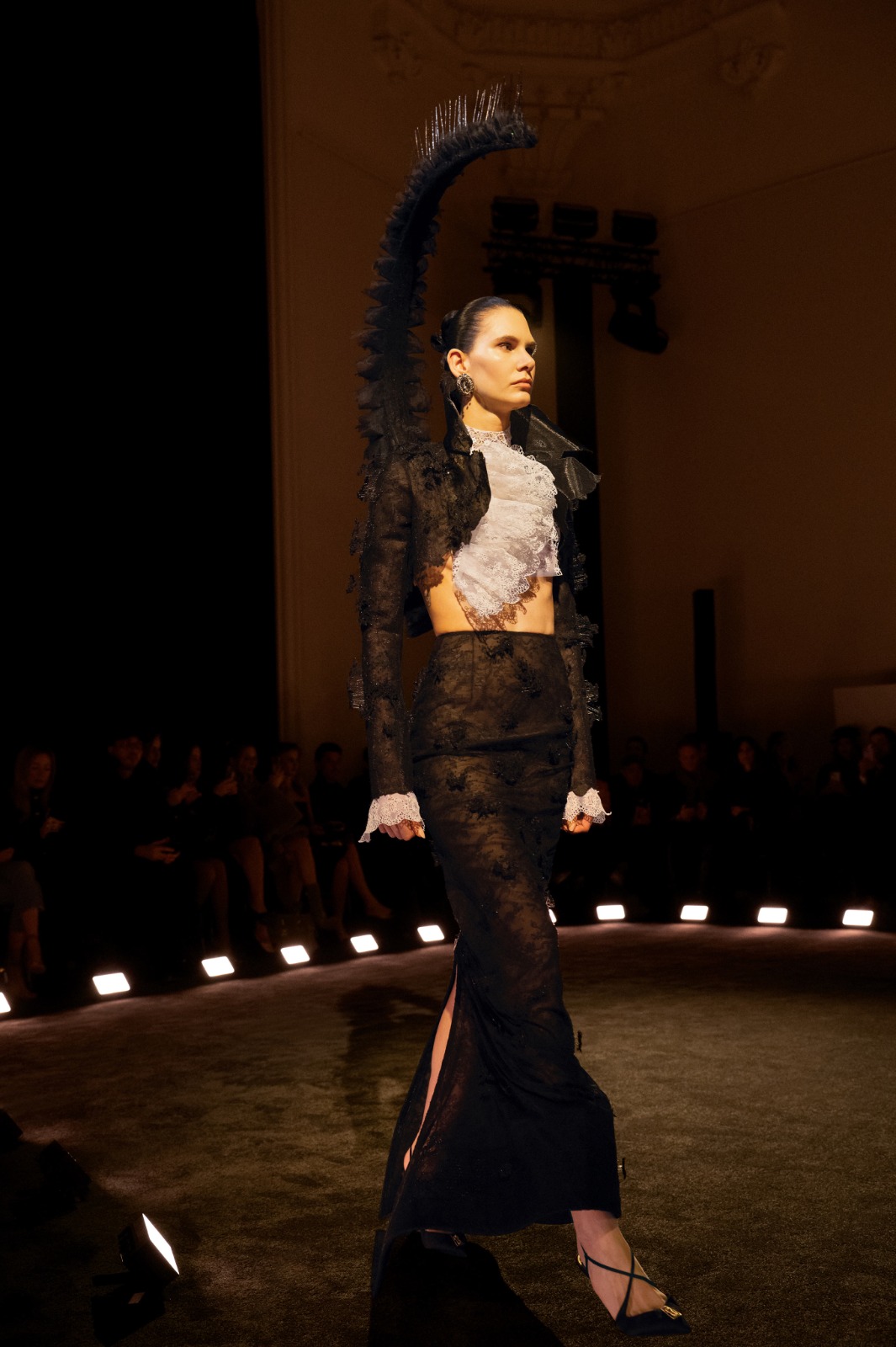 الدانتيل المقصوص يدويًا يُنفَّذ بأسلوب نحتي بارز ليكتسب بُعدًا ثلاثي الأبعاد، مولّدًا عمقًا وظلالًا. الريش — الحقيقي والمُنفَّذ بأسلوب الخداع البصري (trompe l’œil) من باقات حريرية — يُلوَّن يدويًا، ويُرشّ بتقنية الرشّ الهوائي (air brush)، أو يُغمس في الراتنج ويُزيَّن بالكريستال. طبقات من التول الملوّن (neon tulle) تتراكم تحت الدانتيل لتمنحه تأثير sfumato الضبابي، حيث تتلاشى الحواف بتدرّج لوني ناعم.