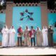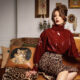 Lily Aldridge wears a custom off-the-shoulder black crepe column evening gown with faille bows and an oversized pink silk faille bow train.